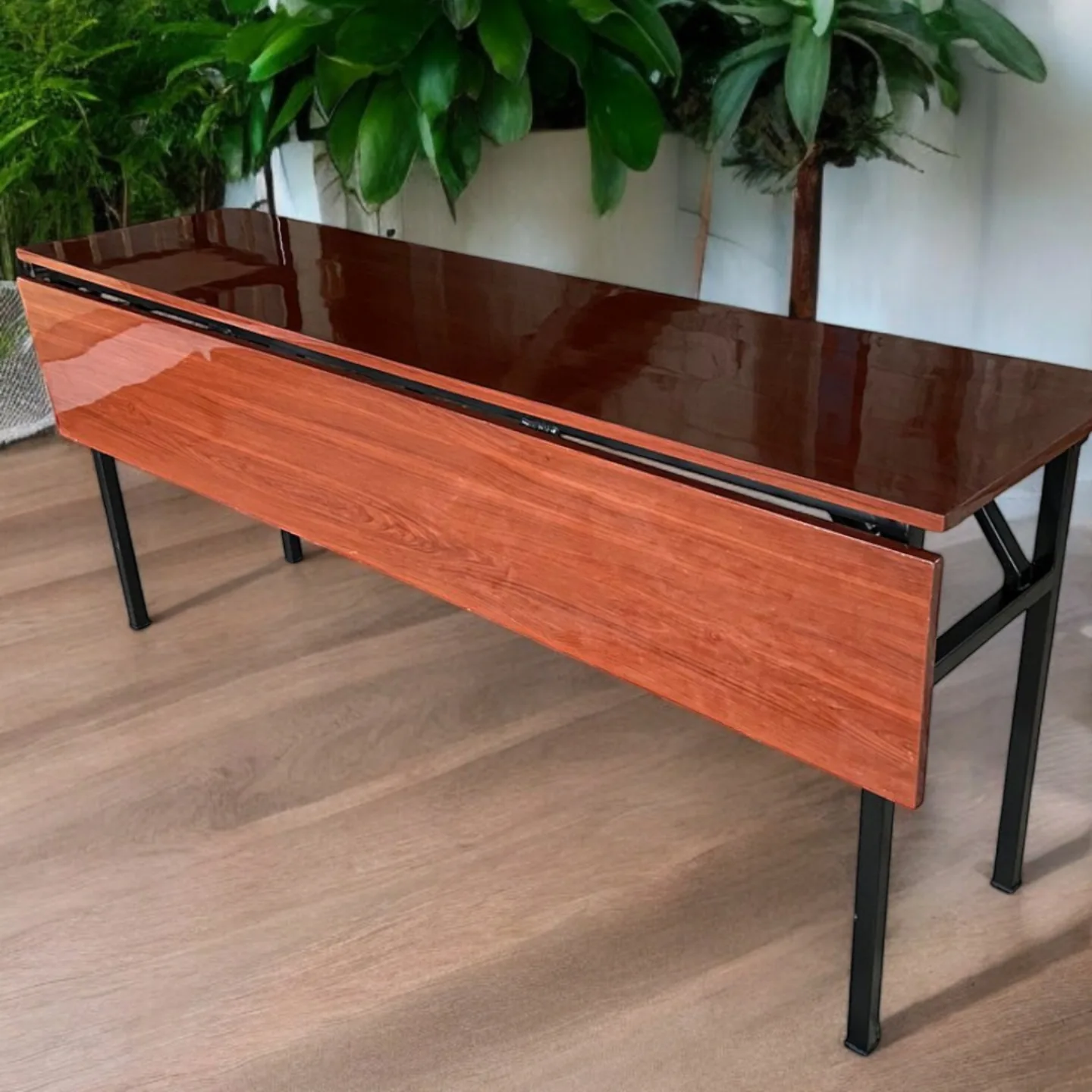 Model meja klasik berbentuk persegi panjang dengan kaki besi lipat dan permukaan kayu laminasi. Tersedia dalam beberapa pilihan ukuran. Cocok untuk acara pelatihan, seminar, ujian, atau ruang kelas sementara. Sangat efisien untuk kebutuhan sewa event karena mudah dilipat dan disimpan.
