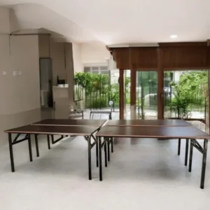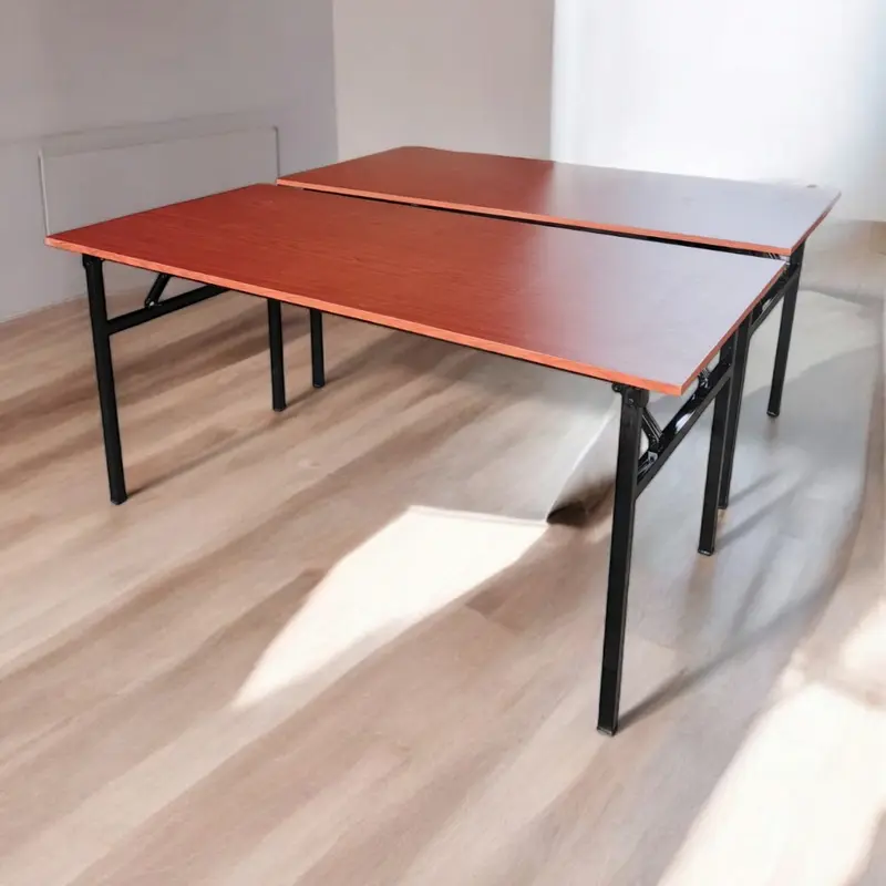 Model meja klasik berbentuk persegi panjang dengan kaki besi lipat dan permukaan kayu laminasi. Tersedia dalam beberapa pilihan ukuran. Cocok untuk acara pelatihan, seminar, ujian, atau ruang kelas sementara. Sangat efisien untuk kebutuhan sewa event karena mudah dilipat dan disimpan.