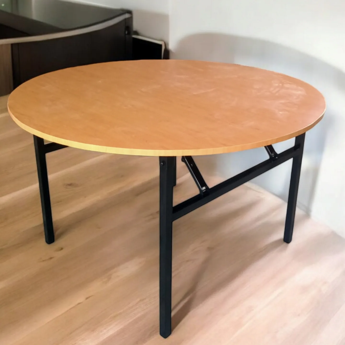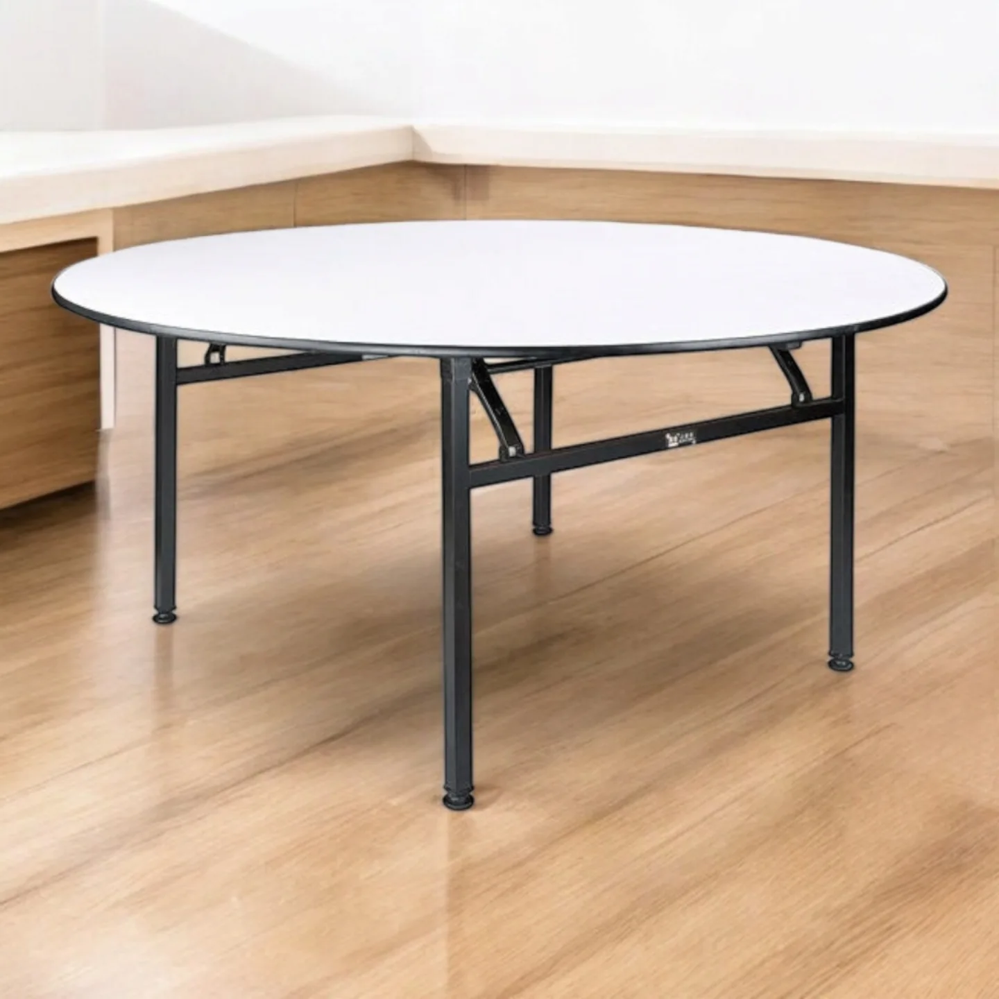 Meja berbentuk bundar dengan kaki lipat dan struktur kokoh, finishing table top bisa disesuaikan. Ideal untuk diskusi kelompok, makan bersama, atau resepsi karena bentuknya yang memudahkan interaksi semua sisi. Mudah disimpan dan dibongkar-pasang untuk event besar.
